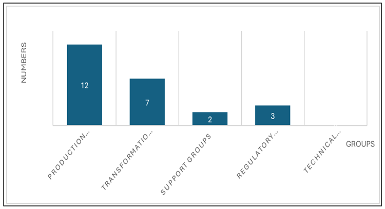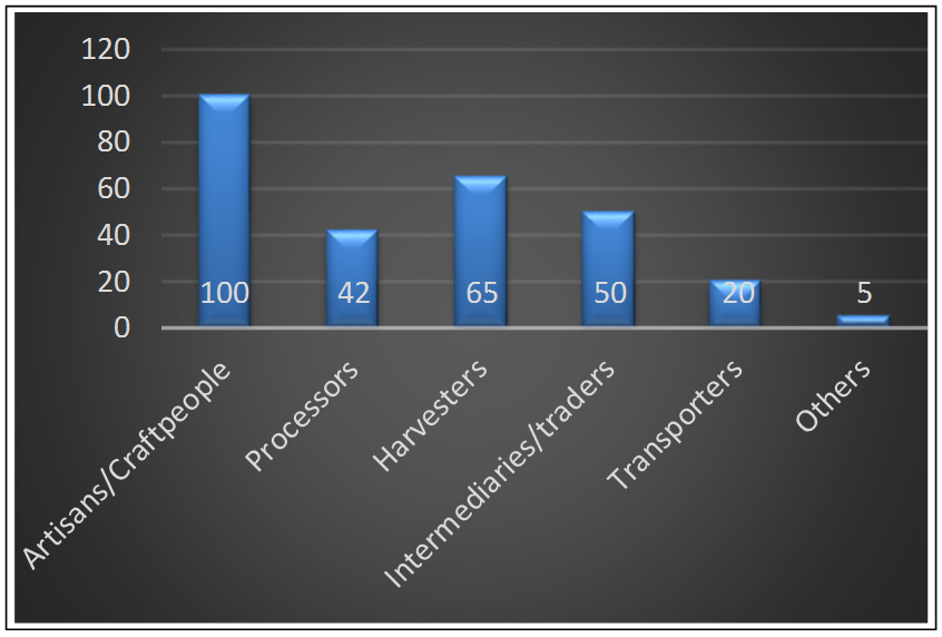 As seen in Figure 4, production groups were the most numerous to have existed in the past. There had previously been groups made up entirely of seasonal collectors, native rattan harvesters, etc., according to more than 31 respondents. This allowed for an over-reliance on community resources on a daily, weekly, or monthly basis, as harvesters, for instance, might easily collect five to ten bundles of cane from a single spot. The responders indicated eighteen (18) transition groups, with the most common being basket weavers and furniture producers. According to reports, there were ten (10) support groups in this area, including traders/middlemen, market sellers, and transporters. It was discovered that three (3) regulatory organizations, including municipal authorities, traditional leaders, and representatives of the forest administration, had previously been on the property. According to respondents during field investigations, there have never been any technical assistance organizations in this area before, such as NGOs or skills development institutes, among others. As seen in Figure 4, production groups were the most numerous to have existed in the past. There had previously been groups made up entirely of seasonal collectors, native rattan harvesters, etc., according to more than 31 respondents. This allowed for an over-reliance on community resources on a daily, weekly, or monthly basis, as harvesters, for instance, might easily collect five to ten bundles of cane from a single spot. The respondents cited 18 transition groups, with the most common being basket weavers and furniture producers. According to reports, there were ten (10) support groups in this area, including traders/middlemen, market sellers, and transporters. It was discovered that three (3) regulatory organizations, including municipal authorities, traditional leaders, and representatives of the forest administration, had previously been on the property. According to respondents during field investigations, there has never been a technical support group in this area, such as NGOs or skills development centers, among others.