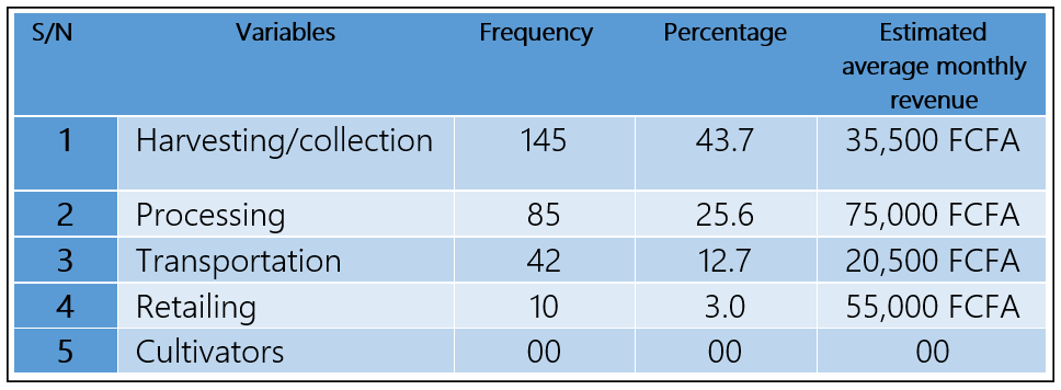 According to Table 1, the monthly rates paid to processors are significantly greater than those paid to any other group involved in the rattan production process. The little value addition on rattan raw materials, such as sorting, cleaning, and drying, is the reason for the relatively high monthly average income of about 75,000 FCFA. As a result, shops and artisans may simply obtain them. This value added justifies the higher monthly compensation. It was also discovered that almost all processors are artists that transform these simple components into intricate shapes. As a result, their chances of making more money are increased. In terms of production, retailers are the second highest earners in the value chain. Even though there are very few, they are very happy with their average monthly income of about 55,000 FCFA. Since there is little to no competition among them, they gain from their small number. Despite being highly represented in the value chain (43.7%), harvesters and collectors seem to earn less than the first two groups of actors. Their low earnings stem from a lack of value because most of them collect and sell rattan directly, albeit with a change in their original shape or form. resulting in a monthly income of about 35,500 FCFA.