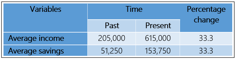 Table 5 shows a significant change in the actors’ financial status in the Meme Division. Compared to their projected average salary of 205,000 FCFA in the past, actors can now claim about 615,000 FCFA, a significant 410,000 FCFA difference. As a result, the percentage changes by 33.3%. The significant increase in the average salary of today has created more favourable circumstances for a stronger propensity to save. This has led to an increase in average savings from 51,250 in the past to approximately 153,750 in the present. As a result, the proportion changes by 33.3%. This increase in average revenue and savings can be attributed to value addition, product diversification, and general price hikes for goods and services. For instance, a basket used to normally cost about 1,500 FCFA, but these days it costs about 5,000 FCFA. Previously, however, a set of chairs would have cost between 25,000 and 50,000 FCFA. These days, the same seats cost at least 150,000 to 200,000 FCFA. Most of the performers revealed this, especially the artisans and weavers.